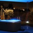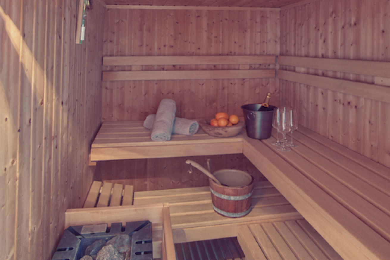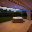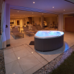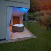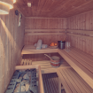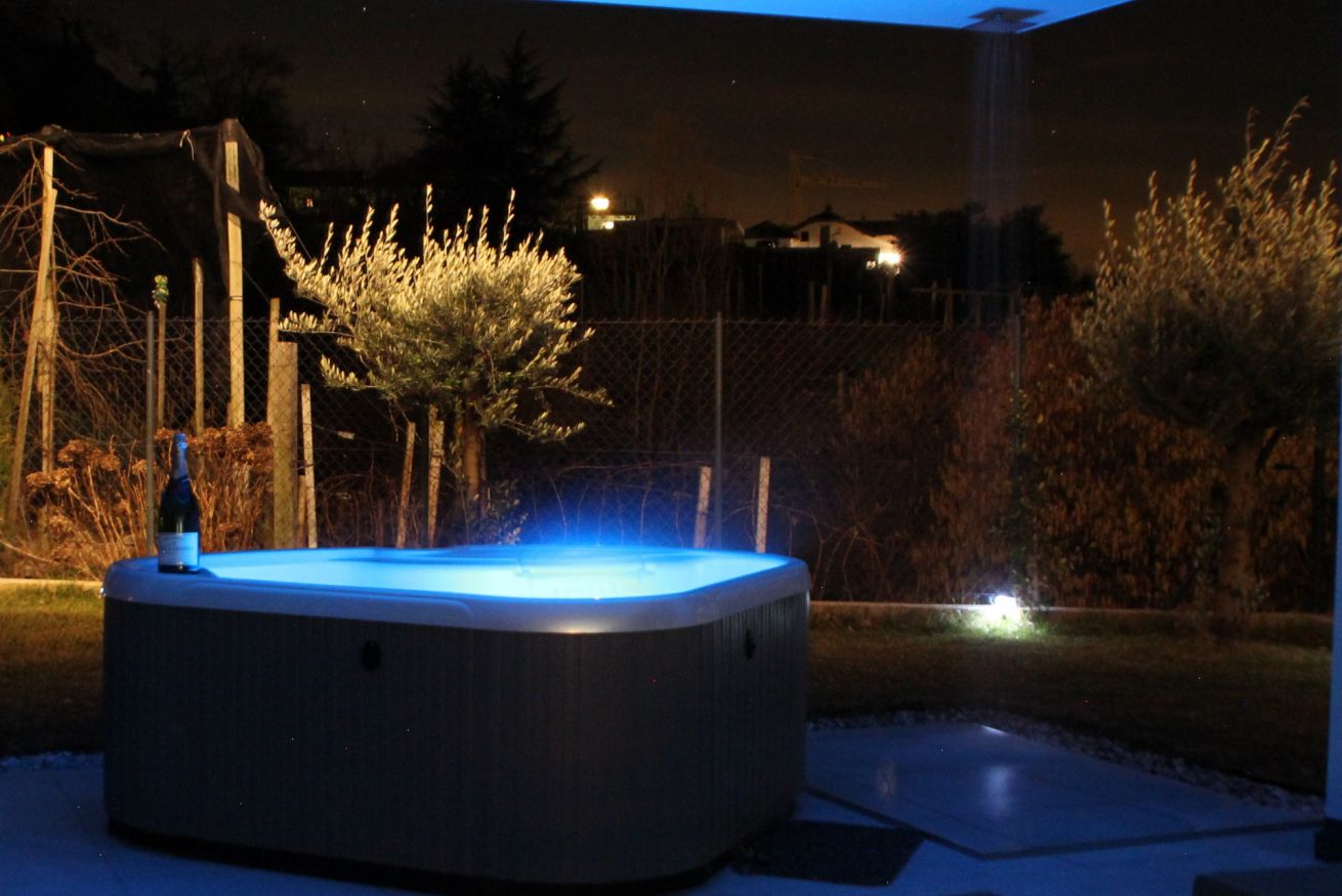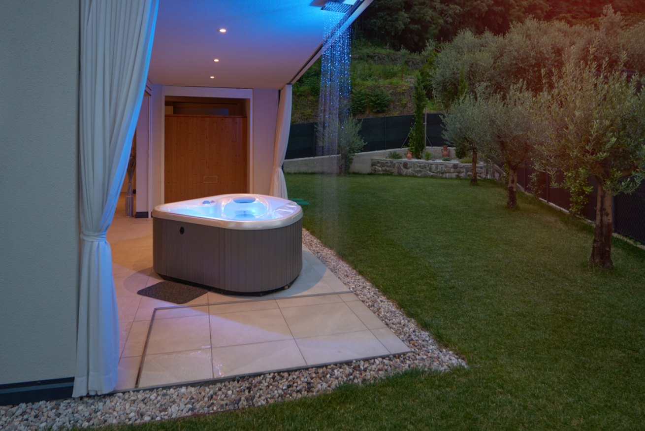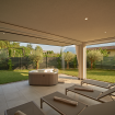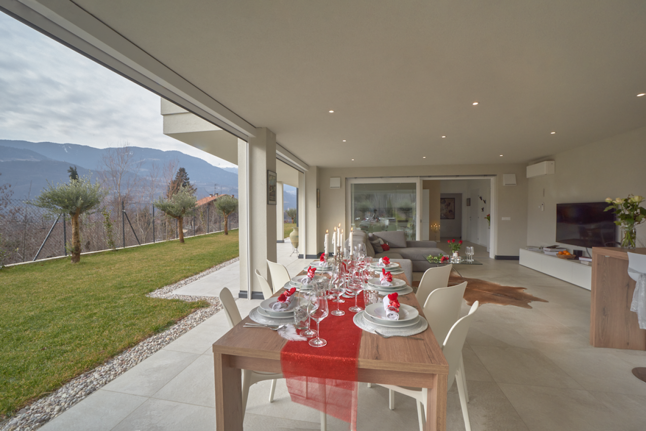 La zona outdoor coperta è suddivisa in una parte living e wellness. La zona living coperta ha un divano esterno, zona TV da 65”, tavola 6 posti, cucina esterna, zona bar. La parte wellness è composta da sauna finlandese, tapis roulant, cyclette, Whirlpool e zona relax.